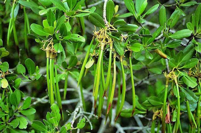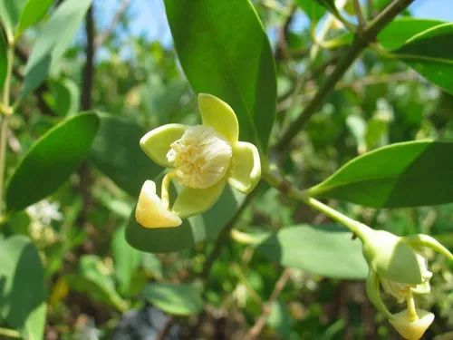 紅海欖為常綠灌木或小喬木,有支柱根,支柱根發(fā)達(dá)。是紅樹林的代表紅樹植物。樹皮灰褐色而光滑,葉寬橢圓形,先端具芒尖。我國雷州半島及海南島沿岸等有分布,生于海岸泥灘上。樹皮含單寧,供藥用,或作染料。