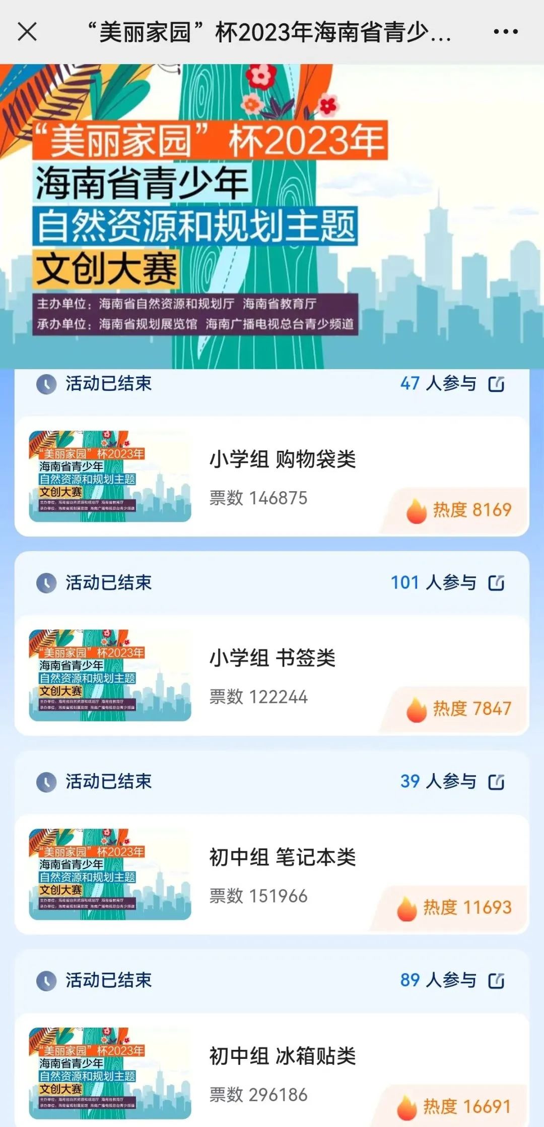 由海南省自然資源和規(guī)劃廳、海南省教育廳聯(lián)合主辦,海南省規(guī)劃展覽館、海南廣播電視總臺青少頻道承辦的“美麗家園”杯2023年海南省青少年自然資源和規(guī)劃主題文創(chuàng)大賽經(jīng)過兩個多月的作品征集,共有�?�、三亞、瓊海、儋州、萬寧、東方、瓊中、屯昌、昌江等八個市縣的47所小學(xué)、20所中學(xué)的師生積極參與,投稿300余件。