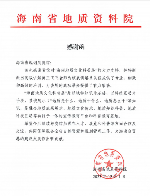 本次培訓(xùn)是為熱烈慶祝海南地質(zhì)隊(duì)伍進(jìn)島70周年,高度滿足海南首個(gè)地質(zhì)文化科普展的接待需求,培養(yǎng)素質(zhì)硬、服務(wù)優(yōu)、形象好的地質(zhì)講解員隊(duì)伍,講好海南地質(zhì)故事,展示海南地質(zhì)形象。培訓(xùn)會(huì)上,王飛飛圍繞“如何成為一名優(yōu)秀的講解員”為主題,精心量身為其打造專業(yè)理論課件,通過講解員的基本要求、工作流程、行為舉止、引領(lǐng)訪客的技巧和訓(xùn)練等分享了12年的講解實(shí)戰(zhàn)經(jīng)驗(yàn)和講解技巧,對(duì)其10名講解員在講解技能、講解禮儀及講解詞撰寫等方面進(jìn)行了精心地一對(duì)一輔導(dǎo),迅速為省地質(zhì)局鍛造了一支速成而有力的講解團(tuán)隊(duì)。王飛飛的專業(yè)、高效、用心授課,受到了省地質(zhì)局蘇金明局長及學(xué)員們的一致好評(píng)和肯定,并特向我館發(fā)來感謝函。