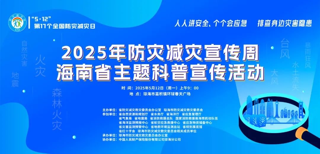 本次活動(dòng)由省防災(zāi)減災(zāi)救災(zāi)委員會(huì)辦公室、瓊海市防災(zāi)減災(zāi)救災(zāi)委員會(huì)主辦,瓊海市防災(zāi)減災(zāi)救災(zāi)委員會(huì)辦公室承辦,中國(guó)人民財(cái)產(chǎn)保險(xiǎn)股份有限公司瓊海分公司協(xié)辦,省自然資源和規(guī)劃廳、省水務(wù)廳、省海洋廳、省應(yīng)急管理廳、省氣象局、省地震局、省消防救援總隊(duì)、國(guó)家消防救援局海南機(jī)動(dòng)隊(duì)伍、省海洋監(jiān)測(cè)預(yù)報(bào)中心、省航空應(yīng)急救援中心、省應(yīng)急物資儲(chǔ)備中心、省災(zāi)害監(jiān)測(cè)預(yù)警中心、省地質(zhì)環(huán)境監(jiān)測(cè)總站、省規(guī)劃展覽館、省紅十字會(huì)和瓊海市防災(zāi)減災(zāi)救災(zāi)委員會(huì)相關(guān)成員單位共同參與。