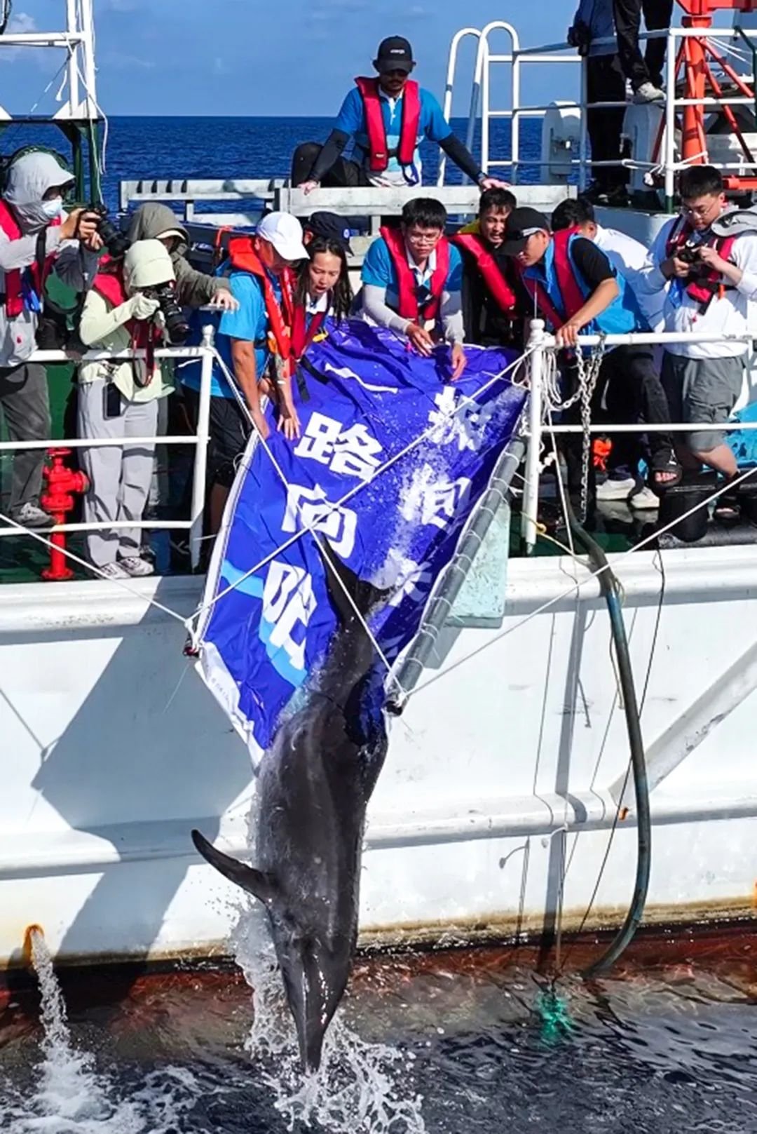當(dāng)天下午4時(shí)40分,在眾人的合力幫助下,“陽陽”從漁政46013船一側(cè)的滑槽滑入大海,回到久別46天的海洋家園。