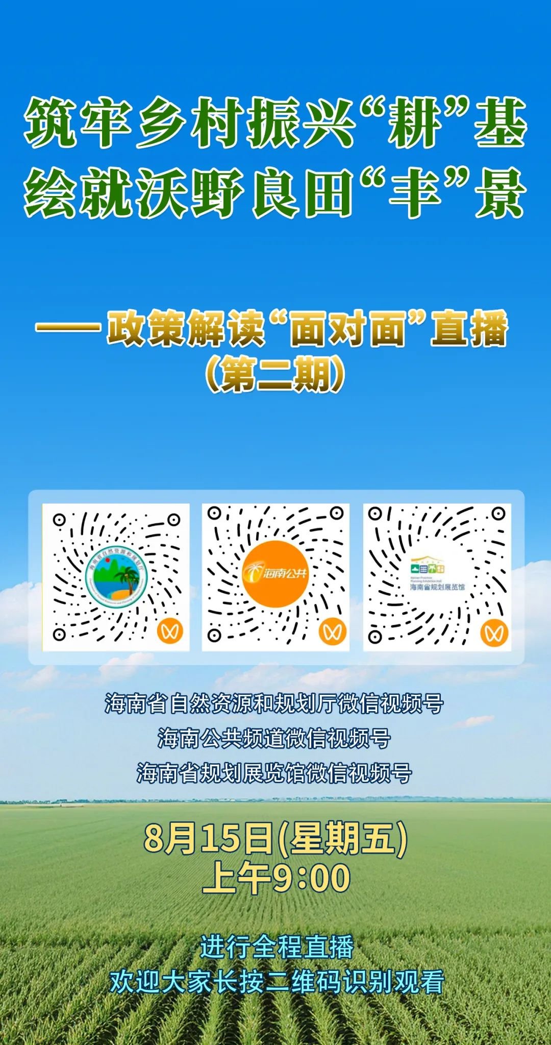 為貫徹落實習(xí)近平總書記對浙江“千村示范、萬村整治”重要批示精神和省委、省政府對鄉(xiāng)村全面振興工作的決策部署,推進我省耕地保護、糧食生產(chǎn)、耕地種植用途管控、土地經(jīng)營權(quán)流轉(zhuǎn)、村莊規(guī)劃編制、農(nóng)房報建和墾區(qū)建房審批管理以及鄉(xiāng)村振興等工作,8月15日上午9:00,海南省自然資源和規(guī)劃廳聯(lián)合海南省農(nóng)業(yè)農(nóng)村廳舉辦《筑牢鄉(xiāng)村振興“耕”基 繪就沃野良田“豐”景——政策解讀“面對面”直播》活動,敬請關(guān)注。
