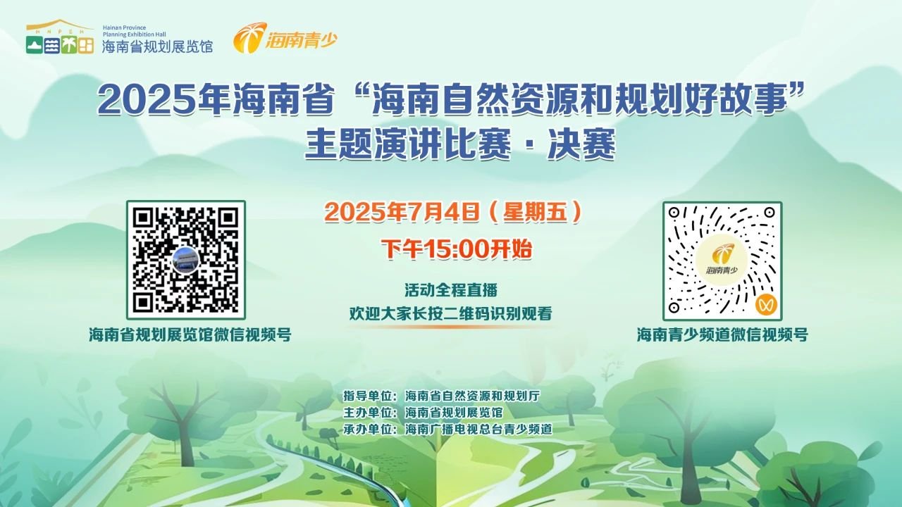 本次決賽將開啟視頻直播 屆時可通過 海南省規(guī)劃展覽館微信視頻號 海南青少頻道微信視頻號 實時觀看決賽盛況! 7月4日15:00 讓我們相約直播間 不見不散! 指導單位 海南省自然資源和規(guī)劃廳 主辦單位 海南省規(guī)劃展覽館 承辦單位 海南青少頻道 來源 | 海南省規(guī)...