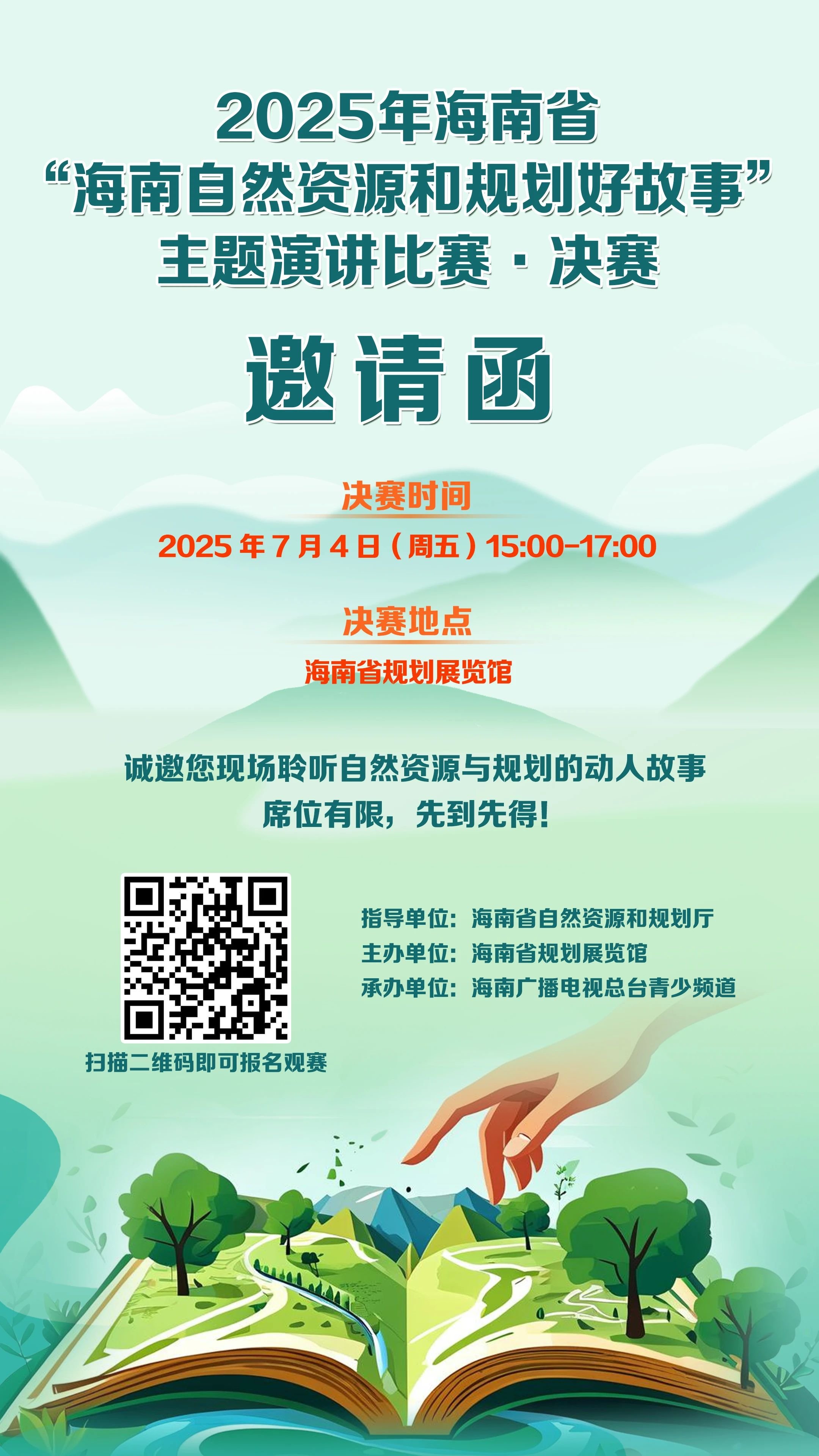 2025年海南省 海南自然資源和規(guī)劃好故事 主題演講比賽決賽 7月4日(周五)15:00-17:00 將在海南省規(guī)劃展覽館舉辦 想親臨現(xiàn)場聆聽? 掃碼報名搶占席位! | 掃描二維碼即可報名觀賽 | 報名截止時間 2025年7月4日上午10:00 指導單位 海南省自然資源和規(guī)劃廳 主...