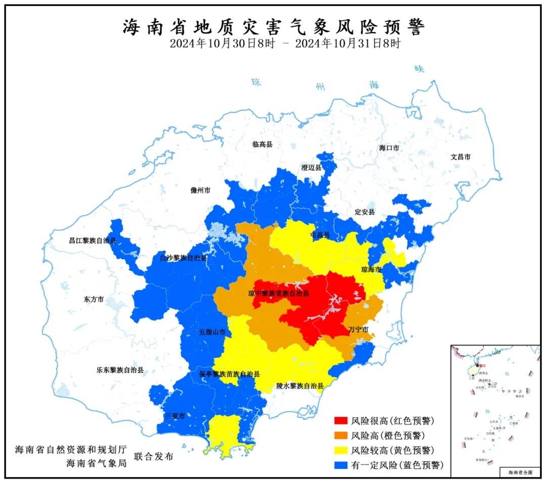 海南省自然資源和規(guī)劃廳、 海南省氣象局2024年10月30日8時 聯(lián)合發(fā)布地質(zhì)災害氣象風險預警: 根據(jù)海南省氣象局前期降雨實況和未來24小時降雨預報,結合地質(zhì)環(huán)境條件背景,預計未來24小時(2024年10月30日8時至2024年10月31日8時) 紅色預警 瓊海市會山鎮(zhèn),萬寧...
