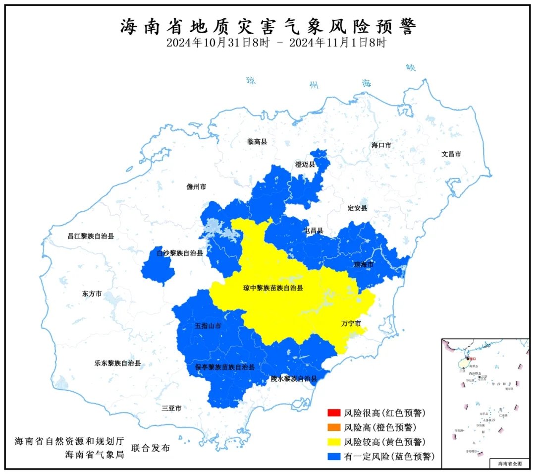 海南省自然資源和規(guī)劃廳、 海南省氣象局2024年10月31日8時 聯(lián)合發(fā)布地質(zhì)災害氣象風險預警: 根據(jù)海南省氣象局前期降雨實況和未來24小時降雨預報,結合地質(zhì)環(huán)境條件背景,預計未來24小時(2024年10月31日8時至2024年11月1日8時) 黃色預警 瓊中縣全境,瓊海市...